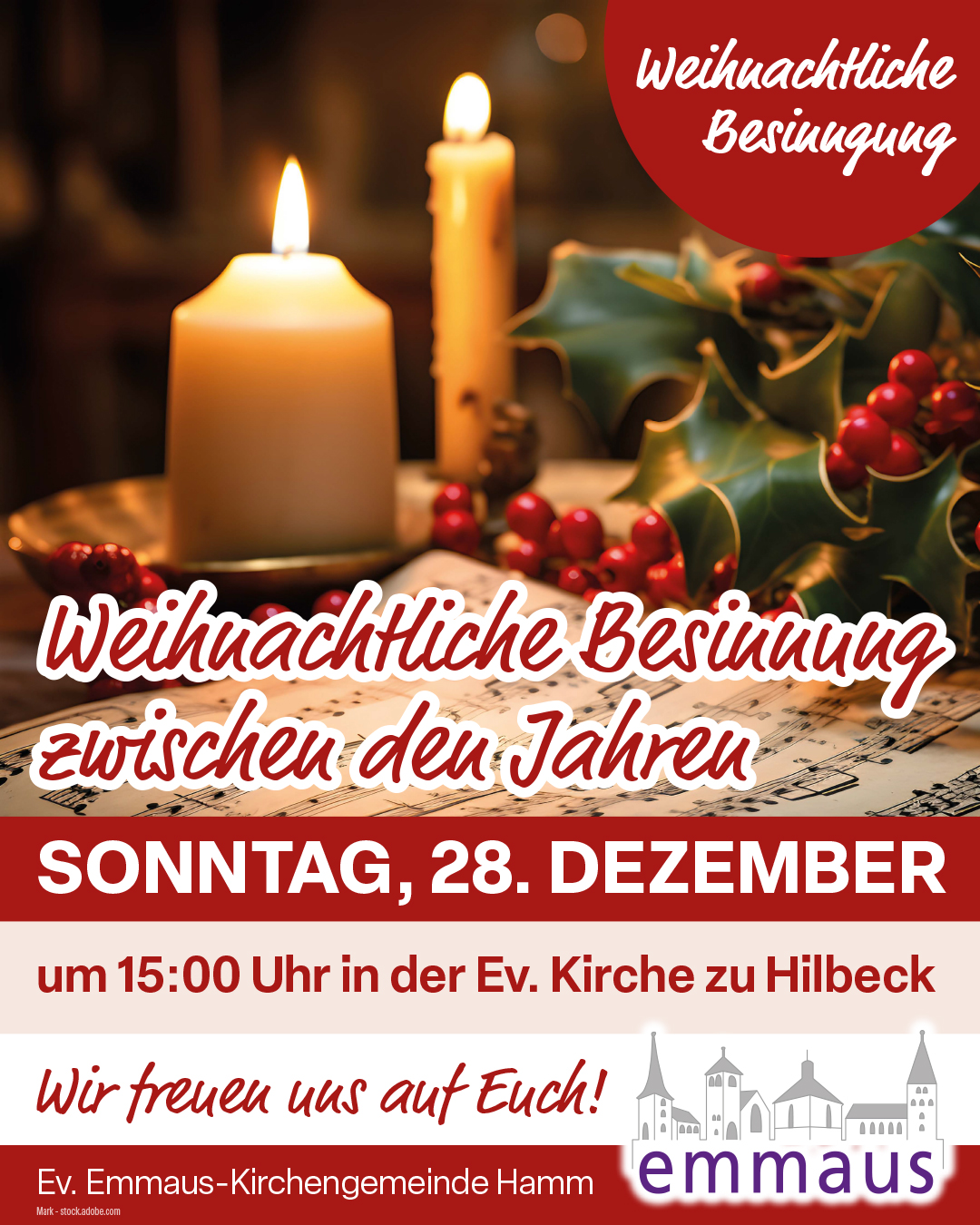 An diesem Sonntag wird es noch einmal weihnachtlich. Wir wollen bei Kerzenlicht gemeinsam singen und Geschichten hören, die uns in die Feiertagsstimmung zurückbringen. Im Anschluss daran lassen wir den Nachmittag mit Kaffee, Keksen und netten Gesprächen ausklingen. Der Hilbecker Posaunenchor freut sich auf einen gemütlichen Nachmittag mit Euch.