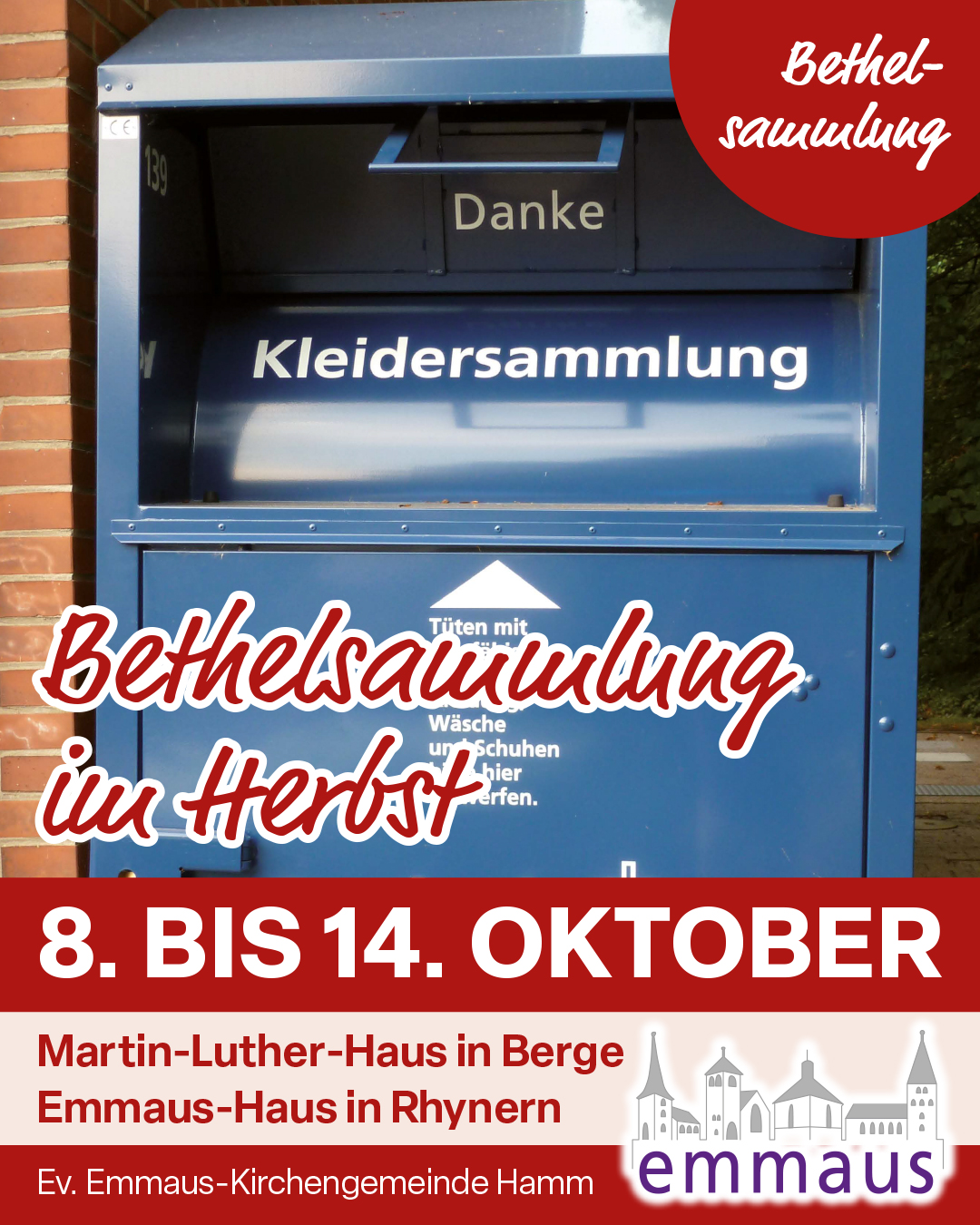Seit einigen Jahren steht am Martin-Luther-Haus ein Container für Altkleider. So können jederzeit gut erhaltene Kleiderspenden für Bethel abgegeben werden. Zusätzlich wird in unseren Bezirken wie folgt gesammelt: