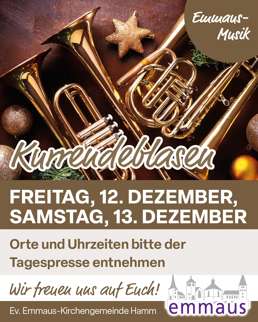 Das Kurrendeblasen vom Posaunenchor Rhynern/Drechen findet wieder am 12. und 13. Dezember statt, also wie gewohnt am Freitag und Samstag vor dem 3. Advent. Orte und Uhrzeiten sind der Tagespresse zu entnehmen.