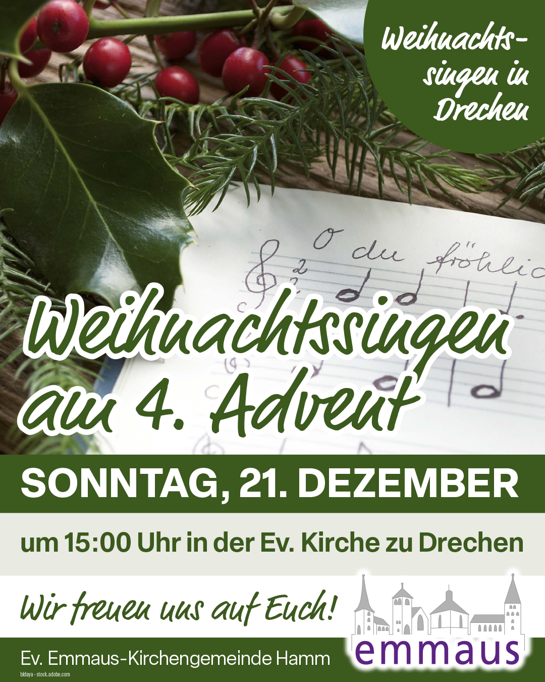 Wir veranstalten in diesem Jahr am 4. Advent erstmalig ein offenes Weihnachtssingen in der Kirche in Drechen. Alle, die gerne singen (egal ob Profi-, Hobby-, Duschensänger) sind herzlich willkommen. Unterstützt wird das Team von Dirk Paulokat und Wolfgang Müller. Beginn ist um 15:00 Uhr. Im Anschluss werden heiße Getränke, Würstchen und Waffeln angeboten.